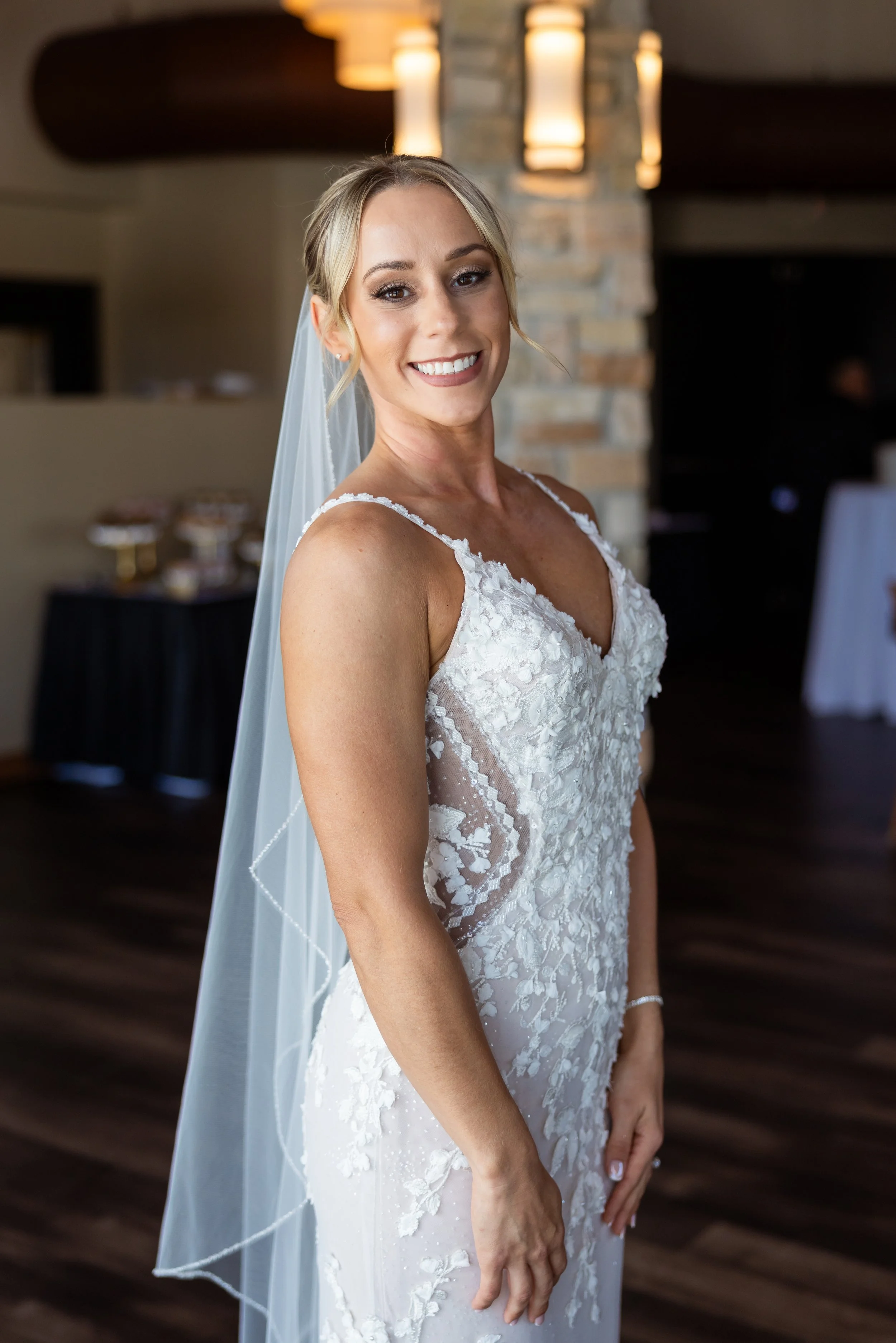 She paired it with a beautiful beaded edge veil by Bel Aire Bridals and was looking SO gorg!