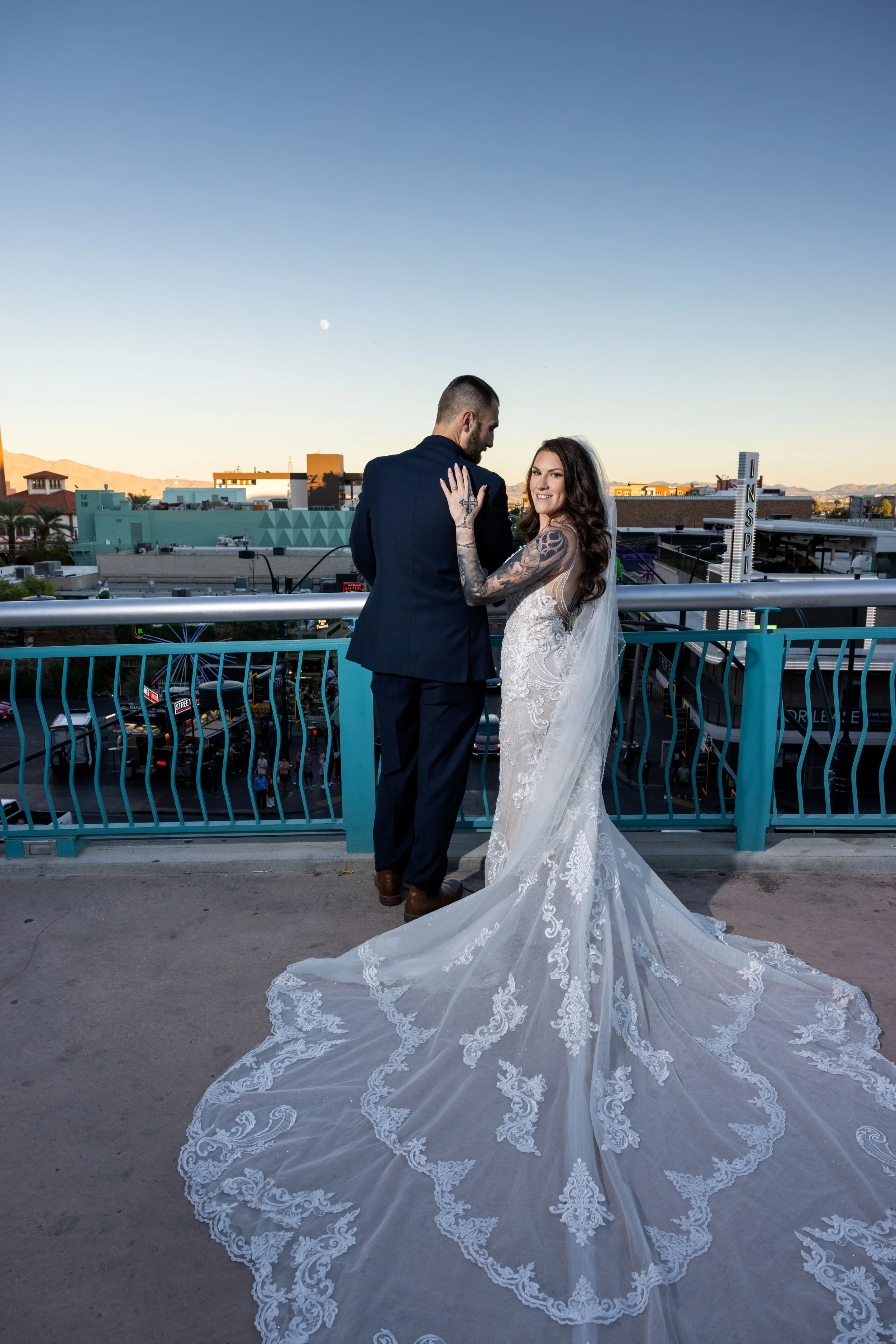 For her October wedding in Vegas, Karrah chose a stunning, fitted lace gown by Essense of Australia!