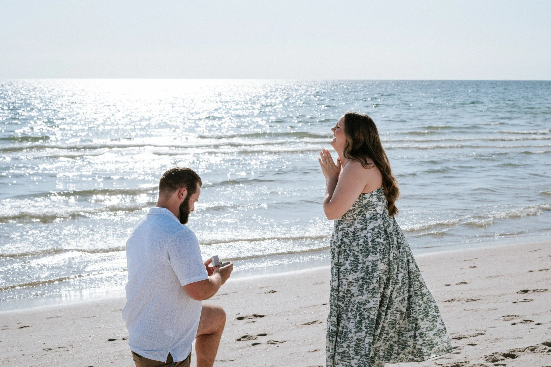 “Brandon proposed to me in June of 2024 on a beach in Naples Florida. He had a secret photographer to capture it all too. Afterwards, we walked to the restaurant we had a reservation at and they had a table in the sand for us with a beautiful meal, champagne, roses, etc. It was perfect!”