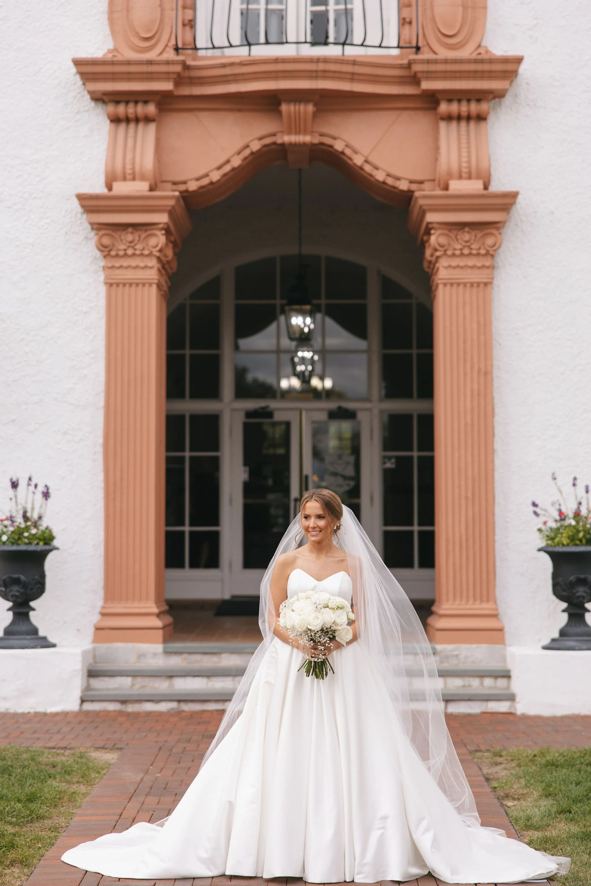 For her October country club wedding, Taylor looked phenomenal in a strapless, satin ballgown from Something Blue’s very own Private Collection, Emilia Leray!
